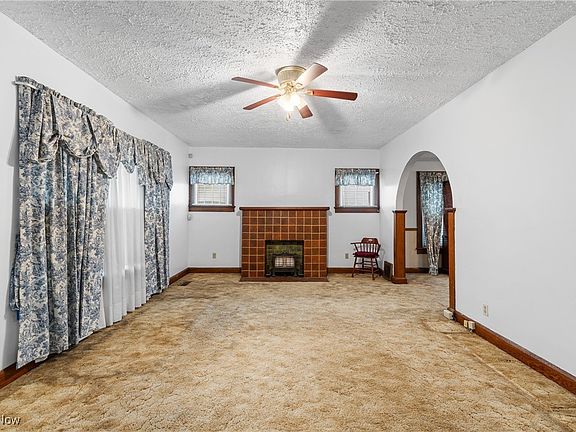 Step onto the covered front porch and into a home full of timeless character. The large living room welcomes you with a cozy fireplace, stunning woodwork, and an arched doorway that flows seamlessly into the dining room, creating a warm and inviting space for gatherings.