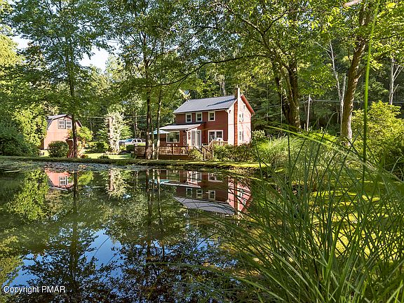 You'll want to come home to this relaxing 3.8 acre property with a 3/4 acre pond that is stream fed. Unwind on your 2-tier deck with the soothing sound of your stream and the abundance of nature around you. You'll enjoy the solitude as you cross your bridge to the pond where you can fish, have your own nature trails or just a quiet place to read. The home has been renovated with the charm of a farmhouse but the modern style that you want today. The 1st level has hardwood flooring and exposed beams. The dining area has windows on 3 walls that allows you to embrace nature. The extremely cozy 2 bedrooms on the upper level have cathedral ceilings with exposed beams. The oversized 2 car garage with a coal stove has a finished 24X30 rec room on the upper level.