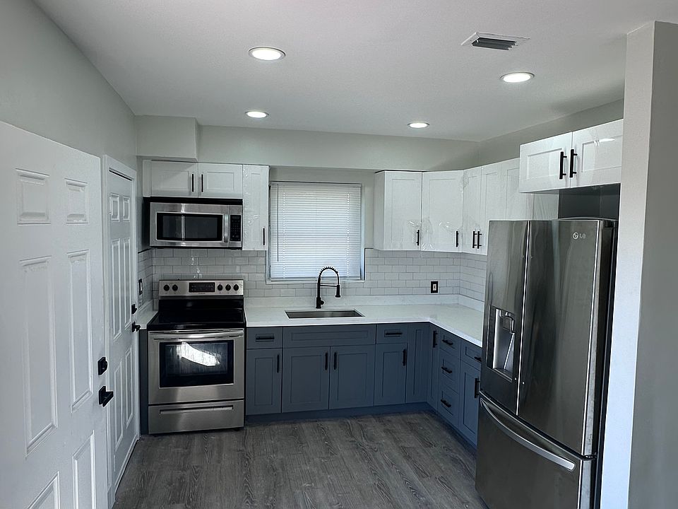 Modern upgradesSleek kitchenGood natural lightStainless steel appliancesFrench-door refrigerator