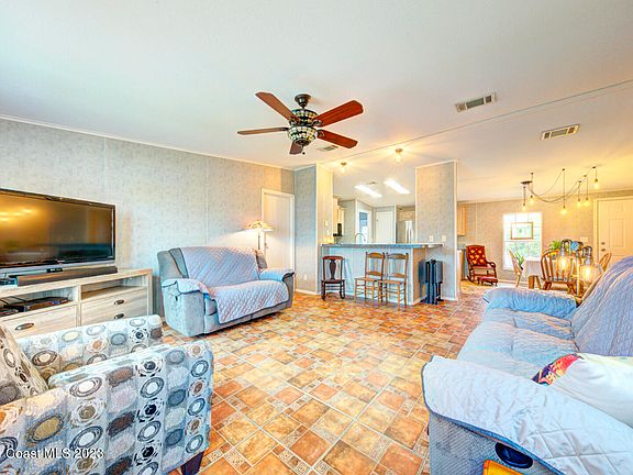Friendly and helpful is what most say about the Lost Lakes community with NO lot rent. You own the land. This water view 3 bedroom, 2 bath unit has new siding, new roof in 2019 and a new air conditioner with blue light and micro filter. House comes with shutters, extra wall insulation and the new built-in microwave is also convection. Even comes with a new stove and disposal. For the crafters this home has a 220 hookup in the laundry! A storage shed out back is connected to the screened in patio with a little dog run. The second bath is freshly renovated to include a walk in shower. Orlando airport or the beaches are only 30 minutes away. Watch all of the rocket launches from the patio. Attend the many functions happening at the clubhouse, play pickleball or just sit by the lake.