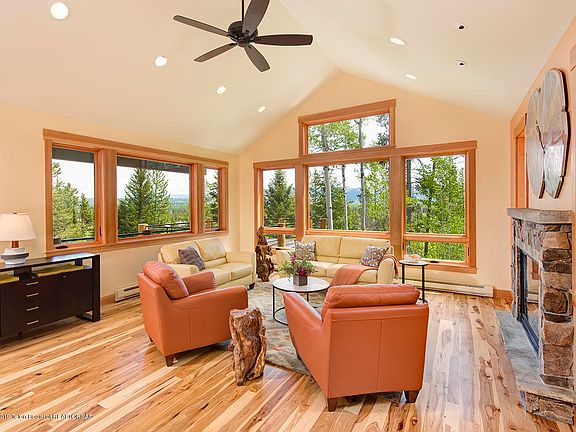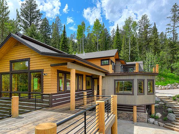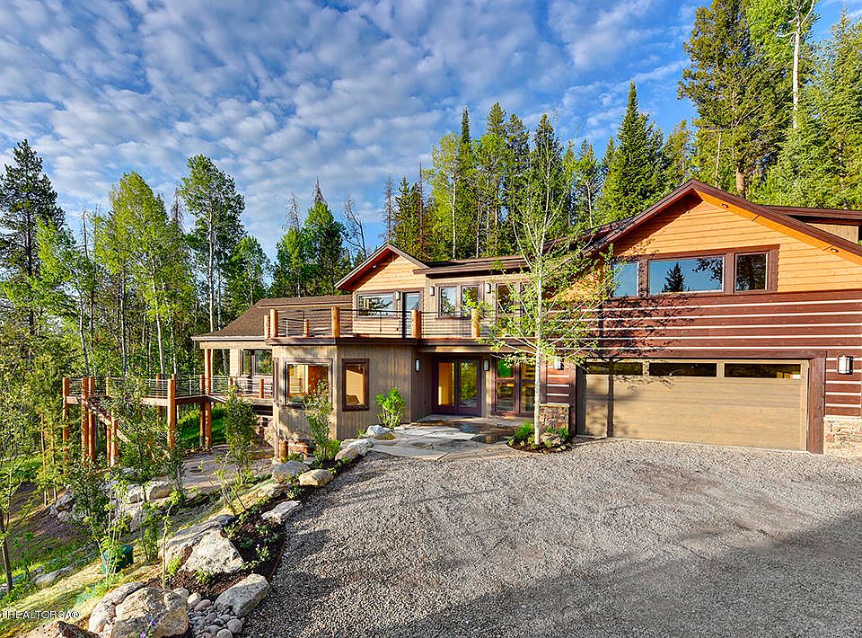 Three short minutes from Wilson and set into the forest is a superbly built contemporary residence with clean lines and layers that appear as extensions of the natural surroundings. Completely renovated in 2015, this three-bedroom, 3880 sq. ft. home is airy, bright and relaxing. An open floor plan connects the kitchen to the living room, which includes entryways to outdoor spaces on both sides. From a gracious master suite to a garden level apartment, each comfortable bedroom contains large windows and provides wonderful solace. A lovely sitting room on the main level could easily function as an overflow bedroom.Multiple levels of decks and terraces allow you to enjoy the outdoors and absorb the peaceful vistas over the Snake River valley below.