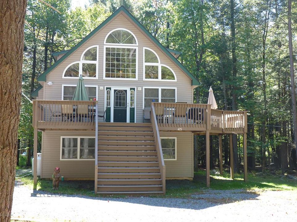 Large well kept chalet just STEPS to lake and beach features 3 stories,5 bedrooms,3 full baths,family room with pool table,living room/dining room combo,kitchen with newer appliances, large laundry room too. Spacious wrap around deck on 2nd floor,3rd floor master suite has it's own deck also. Great rental history. Camelot is a low,low dues community with 2 lakes,tennis courts,beach,swimming,fishing & boating. Township roads & central sewer. Close to I80,& PA Turnpike, Just 4 miles to Big Boulder & Jack Frost SKI area.