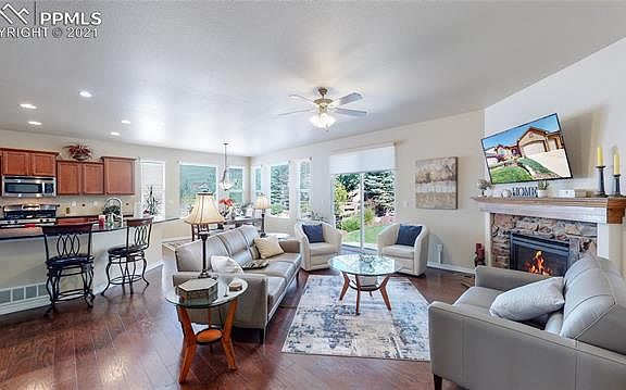 Welcome home to this absolutely stunning Classic Rosewood ranch style home that offers a lifestyle, not just a home, in the highly desired Wolf Ranch community! 10 foot ceilings on the main level and extensive glowing hardwood flooring invite you in. Truly immaculate and better than new, this bright, open concept main level living floor plan offers beautiful upgrades throughout: cook's kitchen with slab granite and full decorator backsplash has a gas range/oven, large pantry, & an expansive breakfast bar. It overlooks the light filled great room and dining area, which walks out to an expanded paver patio complete with pergola & built-in gas fire pit. There is also a gas connection for your grill. The main bedroom is large & tranquil with a lovely 5 piece bath, tile floors, solid-surface countertops, & a generous-sized walk in closet. The isolated front bedroom can be an office or guest bedroom. There are 3 more large bedrooms with walk in closets in the finished basement, complete with 9 foot ceilings. The huge rec room will accommodate large gathers and your pool table, etc. The stucco exterior and good insulation makes for low utility bills. The home has already been tested for Radon with results within the EPA's safe zone. You will enjoy the professional landscaping front & back, and other amenities too numerous to mention. Wolf Ranch is an amazing Master Planned Community that offers amazing amenities: Rec Center (separate fee), parks, pool with splash park, dog park, walking trails, playgrounds, a stocked lake for fishing and boating, and summer concerts and food trucks in the lovely parks. Close to entertainment, hospitals, and shopping. Easy access to the Powers Corridor, Hwy 83, and I-25 for commute to Denver and downtown Colorado Springs. And of course, the very popular school District 20. Be the first to see it!
