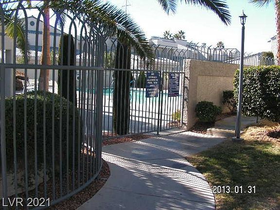 Large 2 bedroom townhome both bedrooms have balconies and separate from each other. Easy care rear private yard area. Gated community with easy access to bus lines, shopping, park across the street and only 3 miles from Las Vegas strip. Unit has a one car garage attached with entry to unit ,also one parking space dedicated to the unit in front the door. All appliances included . Community has a pool, spa , grassy areas, and guest parking.