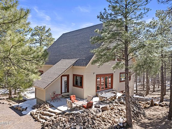 Priced to sell! AS-IS sale and ready for you to add your finishing touches! 4.7 Acre retreat in the Pines with a separate GUEST HOUSE! Beautiful open home with soaring ceilings, multiple expansive open spaces that flow to two open patios, a chef's kitchen with double ovens, 2 sinks, 2 cooktops, walk-in pantry, wine fridge and natural quartz countertops and storage that goes on forever! Located just to the west of Flagstaff in Saskan Ranch, this home is nestled in the pines and offers a main house with 3 bedrooms, 3.5 baths and a separate Guest House with 1 bedroom and 3/4 bath. Both homes are custom owner-built, the Guest House was completed in 2002 while the main house was finalized in 2023. The main house offers many features beyond the beauty of the home such as: Individualized heating for the lower level (hydronic) and main & loft levels (HVAC), A/C for main & loft levels, Sierra Pacific windows, high density foam insulation, 2500 gallon water storage connected to the shared well and an oversized septic system to allow for additional expansion. Additional opportunities to customize and expand the home to meet your needs exist in the bonus room to finish for your specific use, as well as adding an outside deck off the master bedroom or taking advantage of the built-in water stubs already plumbed to the loft, bonus room and potential wine cellar. Come view this home and let your imagination envision enjoying the summer in this wooded retreat! Note: 3rd bedroom is classified as Den/Office by Coconino County for certificate of occupancy. Feature List & SPDS available with additional information.