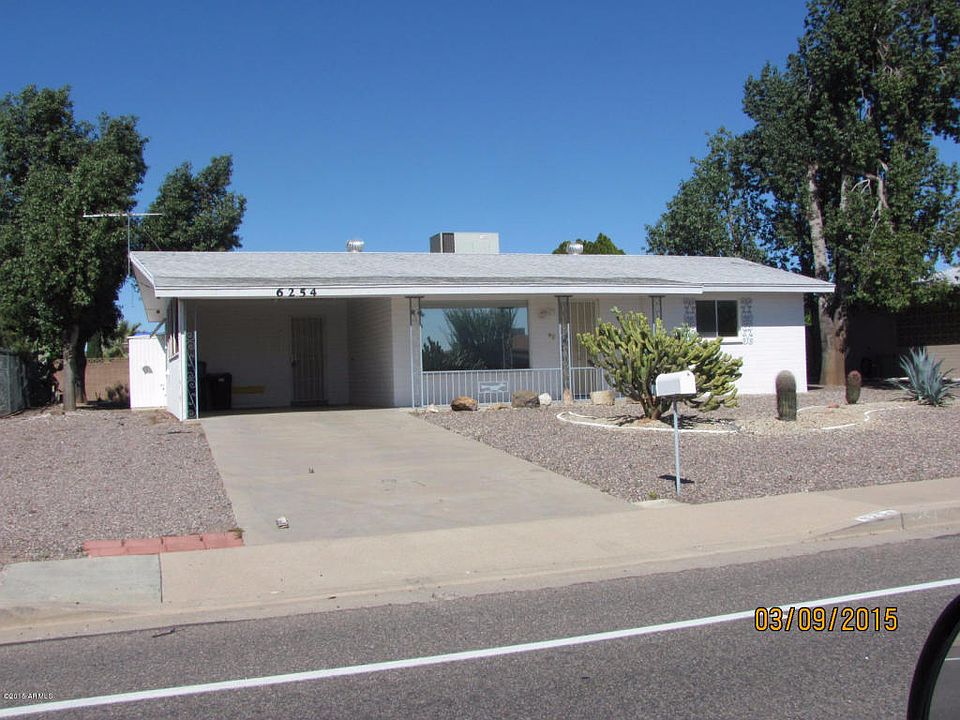 Best floor plan of the community. 2 large bedrooms, and one large bathroom. This home is freshly painted, brand new carpets throughout, New tile flooring in bath and kitchen, new bath sink and cabinet,spacious front living area, fully finished and enclosed Arizona Room with separate a/c unit. Home is set on an extra large sized lot, with multiple shade trees and low maintenance desert landscaping. Home is in great shape and has large additional storage/laundry room off of the carport. Community has several golf courses and community centers.