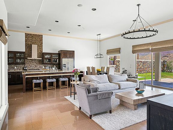Gorgeous hacienda style home with amazing views of the mountain, lots of open space & fantastic curb appeal. Great room connects a culinary lover's kitchen with a spacious living area. 4 bedrooms, 3 baths with an open office and a massage room. Huge master bedroom that leads to backyard includes a walk-in closet, large bathroom with 2 sinks, shower and tub. 2 car garage with an extra separate single car garage on the opposite side of the home. Fresh interior & exterior paint. The backyard includes an Artisan brick oven grill, built in grill & covered patio overlooking Transmountain. This home has lots of privacy and is perfect for entertaining! Features: Custom Window treatments Tankless water heater Updated fixtures throughout home New wood flooring Installed security/cameras Built-in sprinkler system New roof 2022 Option to buy furniture will be extra cost) | %100 of items Furniture is high end and customized specifically for this home by interior designer