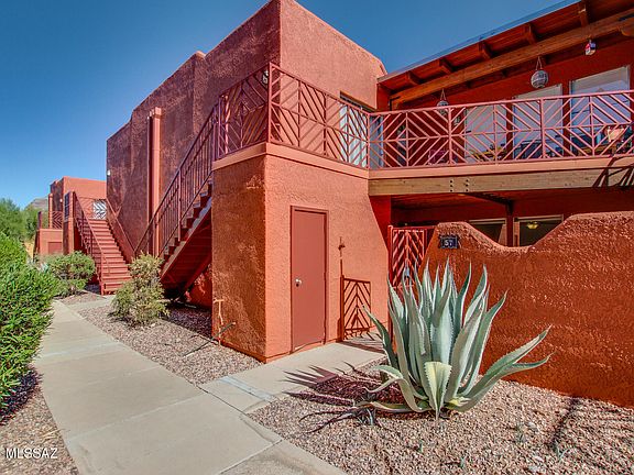 This condominium with remarkable mountain views sits in the Catalina Foothills just minutes to shopping, restaurants, hiking, Catalina Foothills District schools and more. Enter an open living area with woodburning fireplace leading to the dining area. The unit boasts 2024 LG stainless steel appliances, a 2023 LG stainless steel stacked washer/dryer and 2023 Rheem 50gal electric water heater. There is direct access to the patio and a storage closet from the master bedroom, and a security camera for added protection is included. One covered parking space is also included, numerous guest parking spaces are available. The community features a clubhouse, heated pool and spa, exercise room, and two large gas grills next to a covered seating area.