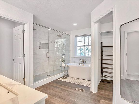 View 3D tour: https://my.matterport.com/show/?m=dewy3VXehut&brand=0&mls=1&. A rare opportunity to own this beautifully updated home in the coveted neighborhood of The Farm. This gorgeous south-facing, 2-story home w/nearly 3,100 sf with 5 bedrooms & 3 bathrooms is ready to move-in. The mature trees, large porch and double door entry w/ Smart lock welcomes you! With over $100K+ in upgrades including new roof & gutters, windows, int. & ext. paint, stained wood floors, carpet, water heater ('22), A/C & Furnace ('23) & much more, this home is ready for its new owner. The light-filled foyer welcomes you w/custom light fixture, shiplap paneling, crown molding, new door hardware throughout and flows into the living and dining rooms. The kitchen includes quartz counters, SS appliances, double ovens, Bosch dishwasher & center island. Enjoy meals in the bright breakfast nook w/large windows or cozy up by the beautiful fireplace in the family room w/new shiplap walls and a gorgeous custom wall feature. The laundry room features new pocket door & flooring. The private & spacious backyard is perfect for entertaining on the stamped concrete patio or relax by the fire pit area. The primary suite w/its stunning 5-pc bathroom includes an expansive custom shower w/dual rain shower heads, freestanding tub, countertops, wall tiles, flooring w/dual walk-in closets. Three additional bedrooms offer ample space including a bedroom w/rough-in for laundry & sink hook-ups & a beautiful bathroom complete the 2nd floor. The partially finished basement includes the 5th bedroom & theater area w/a projector and screen. Amenities include Central Park playground, gazebo, tennis, pickleball & basketball courts. Exclusive Homestead pool, Creekside & Piney Creek Parks, Piney Creek Trail across the street. Close to retail, restaurants, Trails Rec Center and Skate Park, Cherry Creek State Park & Dog Park & Awarding winning Cherry Creek Schools. Easy access to I-25, I-225, E-470 & DIA. Welcome Home!