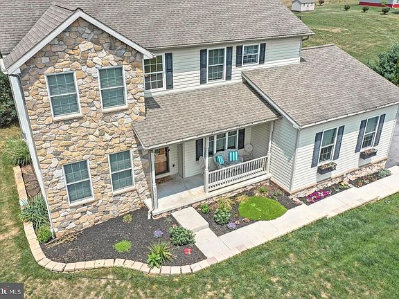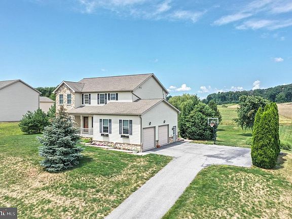 Situated on a Rural 1 Acre lot on a Cul-De-Sac Street, this 2386 sqft two story home offers great country views. Entering the home you will be greeted by an inviting foyer with 2 story ceiling and laminate flooring. 1st floor Office with carpet flooring, crown molding and recessed lighting. Half bath with laminate flooring. Family with carpet flooring, gas log fireplace, ceiling fan and recessed lighting. Enjoy the Eat in kitchen which features, laminate flooring, recessed lights, solid surface counter tops, pantry closet, recipe desk, all appliances, and sliding doors to composite deck overlooking huge back yard. Dining room with tray ceiling, vinyl flooring, ceiling fan, chair rail and picture framing. Mud room with laminate flooring, closet, washer and dryer. 9' ceilings throughout first floor. On the second floor you will find the Primary bedroom with carpet flooring, recessed lights, ceiling fan and walk in closet. Primary bathroom with vinyl flooring, recessed lights, double vanity, jacuzzi tub, shower and linen closet. Three additional bedrooms with carpet flooring, ceiling fan and closet space. Hall bath with vinyl flooring and single vanity. Descending to the basement level, you will be greeted by a partially finished rec room, with a Harman pellet stove. Two additional bedrooms that are fully finished with recessed lighting ceiling fans, and closets. The basement also has 9' walls, and is a walk out basement with a storage room, and utility room. Additional features include a concrete front porch, back deck with canopy, side load 2 car garage, and a very large back yard with a 14 X 24 Shed. This property offers country living, yet is convenient to York, Hanover and Gettysburg and the York Air Port!!! Must see to appreciate.