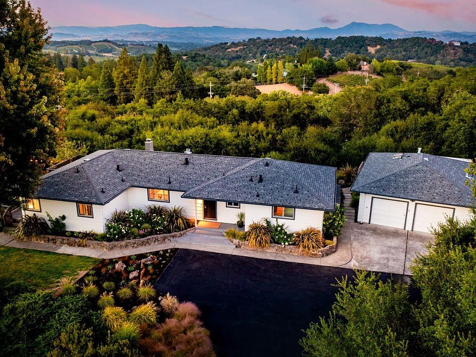Imagine dining al fresco under string lights, the clinking of glasses celebrating a vintner's special as the sun sets over the western horizon. This modern rancher, perched on 1.80+/- acres of rolling hills, offers a blend of luxury and nature. The expansive deck overlooks multiple gathering areas with views of vineyards, Mount St. Helena and the Mayacamas. Wander through drought-friendly landscaping to the fenced veggie garden, grab an egg at the chicken coop, or roast s'mores at a hidden fire pit knoll. At Vine Hill, every moment tells a story of West Sonoma County living. Inside, wide plank wood floors lead through an open floor plan where Fleetwood doors/windows enhance panoramic views. The open kitchen features a dual fuel Wolf range, quartz counter tops an island and breakfast nook. A living/entertainment room, doubles as an office or artist/musicians space, with deck access & built-ins. The primary suite; a private retreat offers a walk-in closet & modern spa-like bathroom with heated tile floors. The JDU, with its sun-porch bedroom, serves for guest quarters or additional entertainment space. The ADU, tucked away from the primary, floats seamlessly in nature and boasts modern fixtures and appliances as well as vaulted ceilings- a perfect wine-country guest house or rental