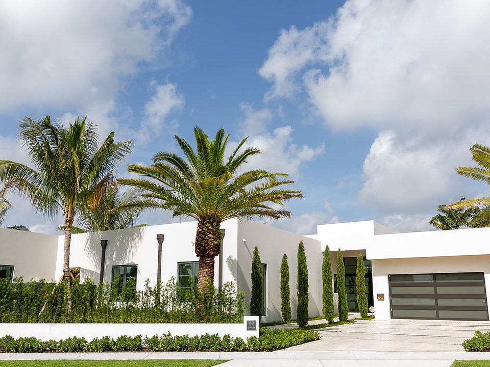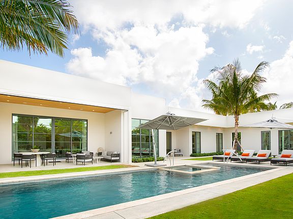 Experience luxury living in this custom one-story home on a +/-17,000 sqft lot on this Intracoastal, east of Olive Ave block. This contemporary masterpiece features 3 bedrooms in the main house, plus a separate guest cottage for added versatility. As you enter, you'll be greeted by exquisite cypress ceilings and soaring ceilings that create an open, airy atmosphere. Enjoy resort style living with a large, heated pool. Car enthusiasts will appreciate the 3-car garage. Designer finishes and clean lines throughout add a touch of elegance. Entertain and dine al fresco in the covered loggia with a summer kitchen. Additional features include, Outdoor shower, covered loggia with retractable electric screens and private sitting room off of the primary suite.