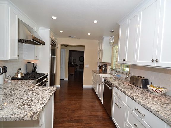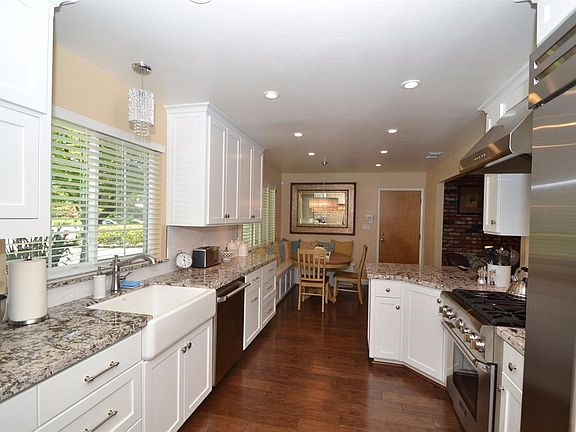 Charming newly remodeled home in NW Fresno on a corner lot. Distressed hardwood flooring welcomes you into this immaculate home. Recessed lighting & crown molding flow throughout much of the home. The bright kitchen was recently remodeled in 2015 w/custom cabinets, granite counters, & Thermador stainless appliances, including a built in refrigerator. There is a cozy banquette w/storage under a lg window to the front yard for intimate family meals, as well as breakfast bar. For larger get togethers, there is a beautiful formal dining room w/plantation shutters. The family room is large w/a brick fireplace & a view to the spacious backyard w/mature landscape including fruit trees & sago palms. There is a covered patio, already wired for an outdoor TV! Down the hall you will find the charming hall bath w/a large skylight & dual sinks to help w/morning rush hour. There is also a massive laundry room/office. The mstr bath has been updated as well! Come see this unforgettable home today!