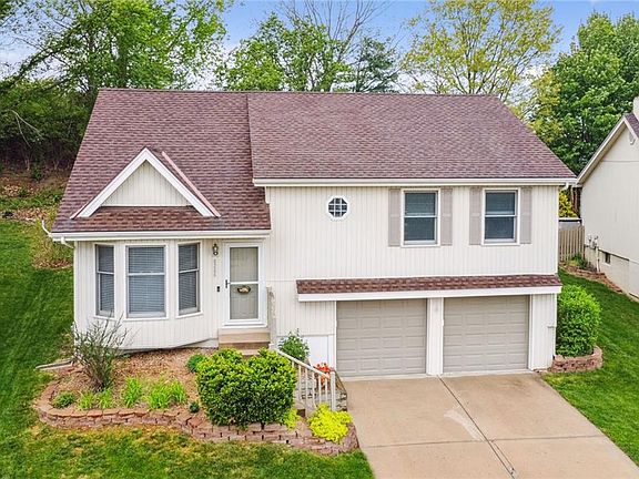 The two story living room with a fireplace welcomes you as you enter this lovely home. The open floor plan boasts a separate living room and family room. There is a large eat-in kitchen with stainless steel appliances. The primary suite has a tray ceiling, ceiling fan, walk-in closet and a private bath. There are two additional bedrooms and another full bath. The deck is off the kitchen. In the lower level there is a nice family room, utility room and an oversized two car garage. All the appliances in the home stay, including the washer and dryer. There is updated lighting throughout the home. Home sits on a quiet cul-de-sac with a beautiful lawn. There is also low maintenance vinyl siding. Great home with lots of space for the money.