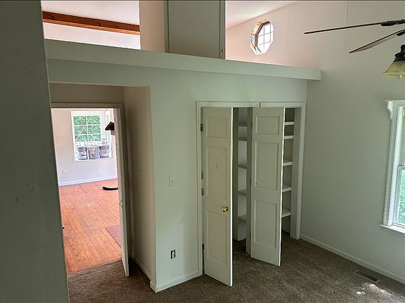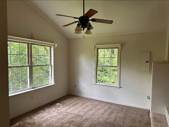 Property is secluded .. with deck , small 10 by 10 garage . Back 2 rooms is vaulted with walk out deck . 4 bedrooms
