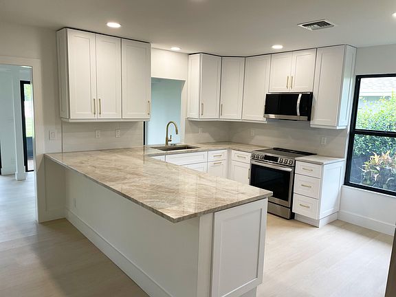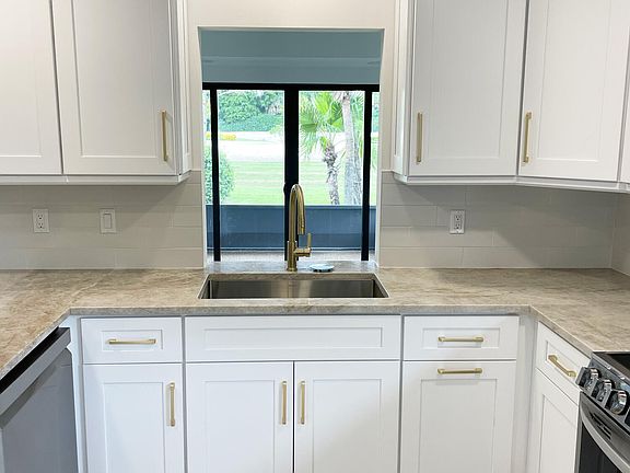 HUGE 3/2 villa with 1 car garage completely remodeled. 2020 Roof, New cabinets, counters, appliances and washer & dryer. Just about everything has been touched. New doors and trim, luxury vinyl flooring, custom vanities and wet bar. Quartzite and quartz counters. Curbless shower in the master. Fully fitted with custom closets in every room! Full hurricane impact windows & doors installed throughout! Right on the golf course with spectacular full range views on the 9th hole of the east course! Eastpointe has a lot of amenities with 24/7 manned security, security patrol, pickleball 2 golf courses & tennis. Luxury fitness center, & pool. Golf Memberships are available.