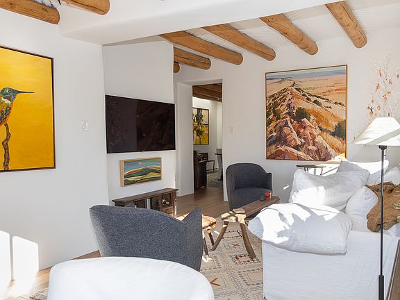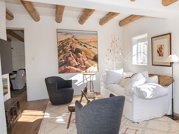 Light-filled Adobe home with 3 garden patios. Newly renovated modern Santa Fe style with authentic adobe plaster walls, latilla ceilings, artisan lighting, skylights, new hickory wood floors, radiant heating and air conditioning (mini-splits). Brand new stainless steel appliances (Z-Line) and separate laundry room with new LG washer/dryer. Walking distance to farmers market, downtown, the Railyard, restaurants, grocery stores, coffee shops, bakeries, world-class hiking and art galleries. Located in the highly desirable South Capitol district with all of the old Santa Fe charm yet modern-day conveniences. Cozy, comfortable in-town living. Available beautifully furnished on a 3-month minimum (or unfurnished with a 1 year lease minimum). Owner pays for all utilities on 3-month rental. Tenant pays utilities on year-plus rental (though utilities are negotiable on one year-plus rentals).