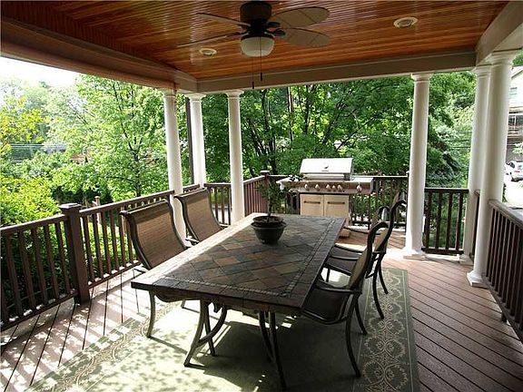 This vintage 1940 junior beam stone Tudor style home has been updated with quality and attention to detail, yet maintains its wonderful period details. Desirably located near Beverly Road's shops and restaurants and convenient transportation to downtown Pittsburgh. * *Entry**A winding stamped concrete walkway leads you to a covered portico entrance. The entry hall is warm and welcoming, with its turned staircase and wrought iron railings** Living Room and Dining Room** A wormy chestnut fireplace wall is the focal point of the living room; double French doors leading to a relaxing custom covered deck. The spacious dining room boasts crown and chair rail moldings, recessed lighting, and hand scraped hardwood floors, continuing from the living room. **Kitchen**The well appointed eat-in kitchen features rich, cherry stained maple cabinetry, neutral quartz countertops, recessed lighting, skylights, ceramic tile flooring, stainless appliances and French door to a side entry. **Den and First Floor Powder** Scraped hardwood flooring continues through the first floor home office. Crisp white pedestal sink and ceramic tile flooring highlight this convenient main floor half bath. **Master Bedroom Suite***Soothing neutral walls and plush sculptured neutral carpeting provide a welcoming retreat in the spacious master bedroom. The master bath features original Carrera tile walls, basket weave flooring, and walk -in shower. An ample walk-in closet completes the suite. **Bedrooms 2 and 3**The bedrooms are all surprisingly spacious, each with ample closet space Original 8 panel stained wood doors throughout the home. **Third Floor Bedroom 4**The third floor bedroom has been beautifully finished, with mocha textural pindot carpeting, soft seafoam walls, and a completely independent HVAC system. There is an additional roomy storage area on the third floor. ** Game Room and Covered Deck**The walk out lower level features a game room with recessed lighting, decorative fireplace, and access to a covered rear patio.This newer custom covered deck is maintenance free, designed with substantial pillars, wood ceiling with fan and recessed lighting. ** Additional Features**Ample side-by side 2 car garage, ceramic tile roof, high quality stained casment windows thruout , high efficiency furnace, concrete rear drive, great dead end street. Served by the top-rated Mt. Lebanon School District!
