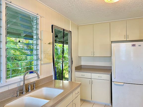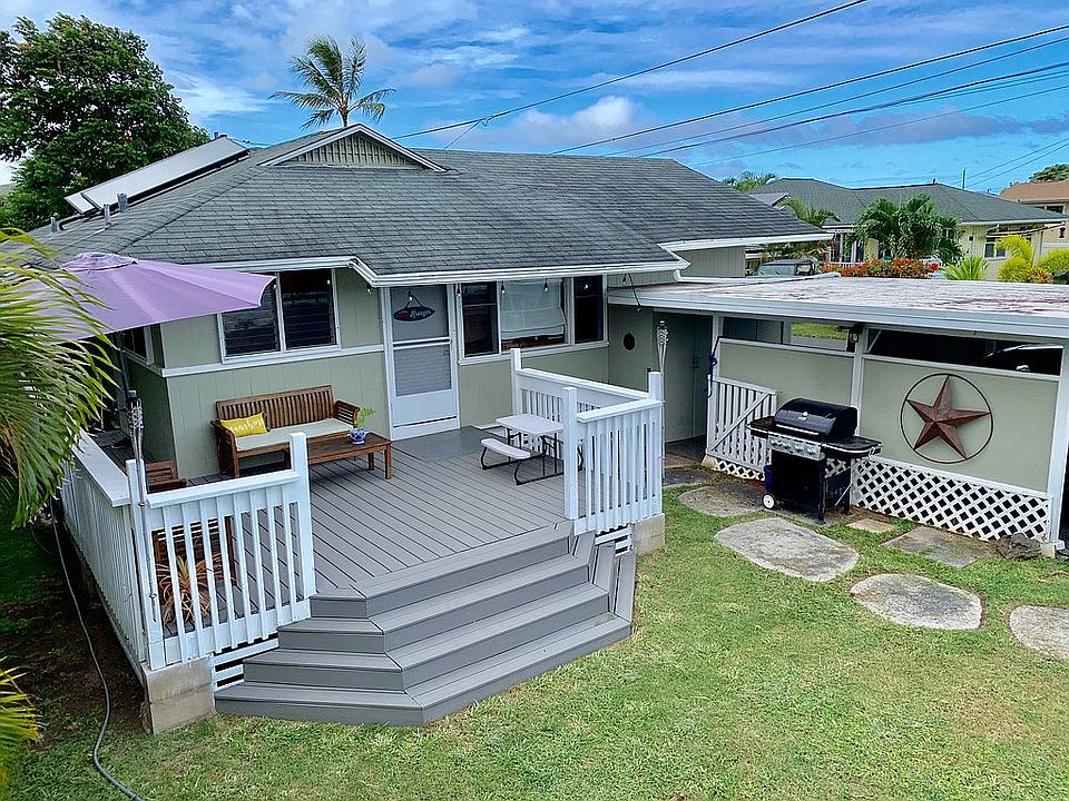 Move in May 1! Walk to Kailua Town or the beach! This beautiful 3 bedroom 2 bathroom house has split AC (brand new unit in living room), mountain views, and a fully-enclosed yard with newer white vinyl fence. Elevated construction maximizes those cooling trade winds. The water heater is solar powered, and the indoor full room sized utility room has a large capacity washer/dryer, loads of counter tops, cabinets and an extra closet. You'll find ceiling fans and pine flooring throughout, a second pantry, a linen closet, enclosed carport shelving, a backyard storage shed---even a walk-in closet. Relax and watch the moon rise while palms rustle in the evening breezes from the 194 sq ft lanai. Cruise to Kailua and Lanikai beach, or walk to Kalama Beach Park. Walk to dinner at nearby Maui Brewing Company, Goen, Lanikai Brewing and more! Watch the morning sunlight dance on Olomana and the Ko'olau Mountains while pouring coffee in the kitchen. Pest control included. Ideally located between the H3 freeway and the Pali Highway for easy access to Pearl Harbor/Hickam (30 min), Schofield (40 min), Camp Smith (25 min), and MCBH Kaneohe (10 min). 1320 permitted sq ft, plus 194 sq ft lanai, one covered carport parking space, plus additional parking. Situated on a private cul-de-sac--perfect for kids riding bikes. Come live that Kailua life! Rent is $4700/mo. Security deposit is one month's rent. Tenant to pay utilities