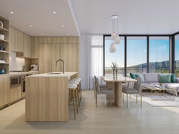 Take in the spectacular Northwest views of Burnaby Mountain Enjoy the bright and airy feel of this spacious 2 bedroom home. This exceptional layout offers 9' ceilings and an open concept kitchen, dining, and living area leading straight out to the large north-facing patio with mountain views. Bedrooms are separated by the living area for extra privacy and feature a walk-in closet and private ensuite in the primary bedroom, and ensuite access to another bathroom from the secondary bedroom. EV-ready parking and storage are also included! This brand new home is conveniently located only a 5 minute walk from shops, restaurants, the Burquitlam Skytrain Station, trails and more - making it the perfect urban haven in West Coquitlam.