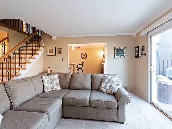Beautiful 2-Story Brick Townhome. 3 spacious Bedrooms, 2.1 Bath w/Finished Basement. Upgraded Kitchen w/Quartz countertops, Breakfast Bar, Backsplash, Under and upper cabinet lighting. The kitchen area includes Hearth fireplace with simulated fire. Updated staircase with hardwood floors and wrought iron railing, Hardwood Floors in Kitchen, Dining Room, Eating Area, and upstairs hallway. Large Laundry Room in Basement. 2 car garage with storage attic space w/drop-down staircase in the garage. Nest thermostat.