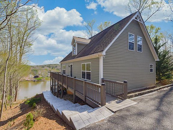 Beautiful contemporary lakefront home with private, deep water, year-round access (20+ ft), large wrap around two tier deck with hot tub. This 3 bedroom, 2.1 bath home features easy one-level living with a maintenance free exterior and an oversized detached garage perfect for a car enthusiast or hobbyist. Entry level boasts great room w/ vaulted ceilings plus plenty of windows to enjoy picturesque sunrise views on the water. Open concept kitchen, dining, and living room are perfect for relaxing and entertaining. You'll love the convenience of the entry level master suite and laundry. On the upper level, you will find an additional master suite and an open office loft with a cozy seating area filled with natural light and a bird's-eye view of the lake. The lower level finished basement i Game room, and bar area, plus a bonus room currently being used as office (could be additional bedroom). Plumbing already in place for full third bath in lower level. Waterfront features single covered dock with boathouse, lift, and floater. Don't miss this amazing opportunity to enjoy peaceful summer days on your own slice of Smith Mountain Lake!