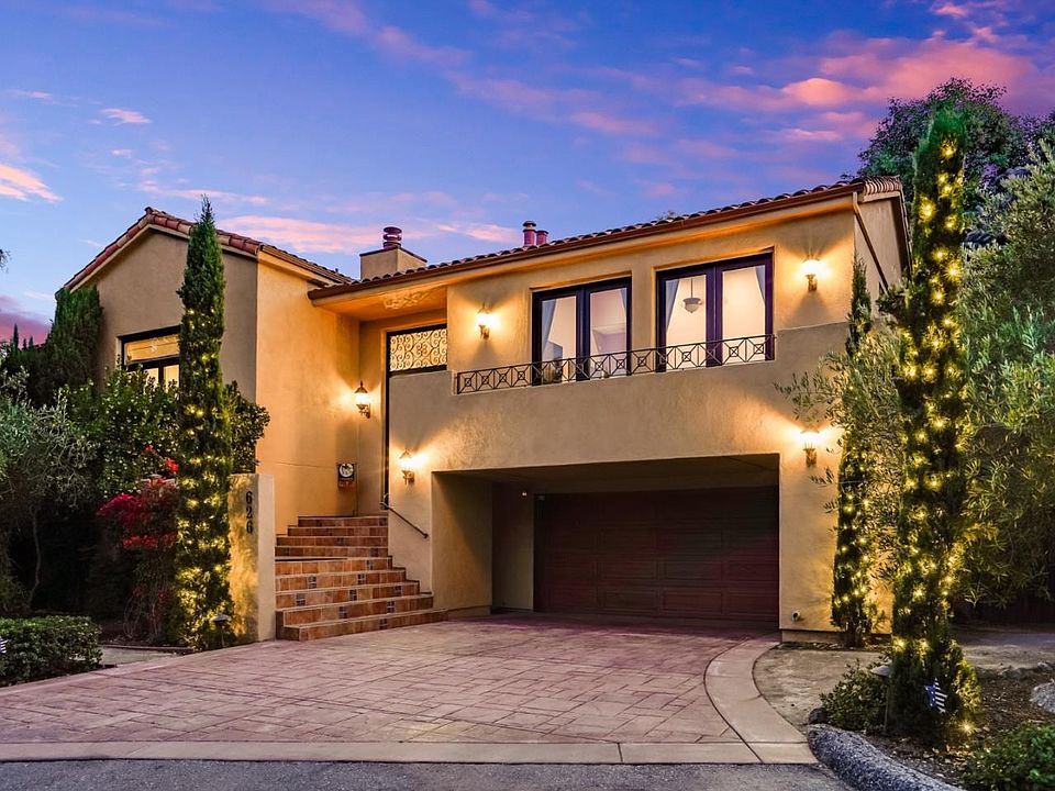 Property now available for showing. Vacation at home in this 2-level Mediterranean-style villa. Solar-heated pool with waterfall feature, in-ground spa, lawn area with greenhouse, or dine al-fresco on sunny tiled deck. Entry-level has soaring ceilings in entry, living room, and dining room. Towering windows allow lots of natural light. Bamboo wood floors in LR, gas fireplace with floor-to-ceiling display niches. Gourmet kitchen open to family room with stainless steel high-end appliances, central island with sink and breakfast bar. South Bay views from kitchen windows also overlook side yard. Family room with raised hearth fireplace, high ceilings, double French doors w/security screen doors. Master suite w/fireplace, relaxing soaking bath, separate shower, walk-in closet, private balcony. Lower level w/2nd family room w/wet bar, 3 BRs, laundry, 2 Baths. Security cameras. Pool cover being replaced Feb 9th. Garage w/locking storage cabinets. Pool room. Distinguished Roy Cloud School.