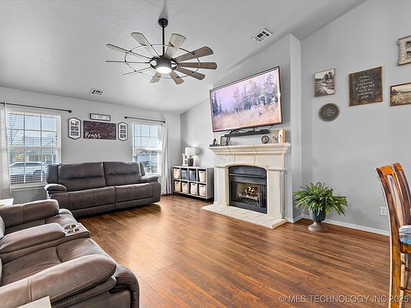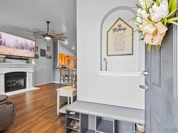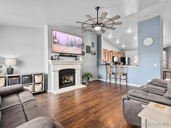 This beautifully updated home boasts a host of recent upgrades, including a brand-new roof (2024), new luxury vinyl flooring (2021), and freshly painted interior walls that add a bright, clean feel throughout. The open floor plan features a vaulted ceiling in the living room and a cozy gas fireplace, perfect for entertaining or relaxing at home. Enjoy the convenience of a new dishwasher, garbage disposal, and gas stove in the well-equipped kitchen, which also includes a built-in microwave, refrigerator, and a spacious pantry. Additional updates include new ceiling fans, stylish new door handles, and security system wiring for peace of mind. The primary bedroom offers a private retreat with a walk-in closet and full bath. This home truly combines comfort, style, and functionality.