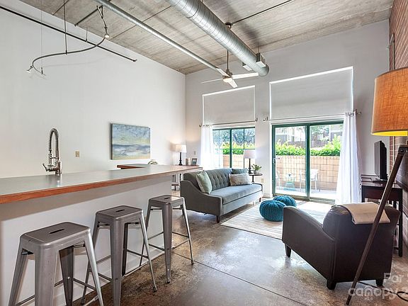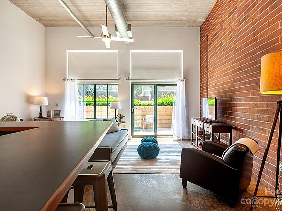 Your chance to live in Uptown's historic Fourth Ward in this stylish loft condo. This is a rare first floor unit and one of only four in the building with a private, brick walled courtyard. Inside, there's a cool industrial feel with stained concrete floors, exposed brick walls & ductwork, and 13 foot ceilings. There's white painted cabinetry in the kitchen, with newly installed stainless range, microwave and refrigerator. Unit just painted throughout and move-in ready! One bedroom and one bath with dual closets and laundry. Easy access from this location to I-277, and to all that center city has to offer. Welcome home!