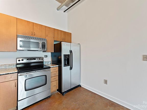 Gorgeous Charlotte skyline view from this charming loft condo!! Enjoy the convenience of living in Charlotte's Fourth Ward neighborhood with close proximity to all that Charlotte offers! Great industrial feel with concrete floors, exposed brick walls and ceilings. This 4th floor unit has the convenience of the elevator, the best city views and the tallest ceilings in the building! The open concept Kitchen includes stainless steel appliances and breakfast bar. The bathroom has been newly updated with floating vanity, new lighting and walk in shower. This beauty has a custom closet AND additional ceiling storage at the entryway to best utillize the space! The focal point is the custom built flex room with reclaimed windows,sliding barn door and soft mood lighting that faces the living room. Outside of the flex room is the perfect space for a reading area or desk! Don't let this city view loft away. Easy access to 4th Ward park, both stadiums, shopping and restaurants.