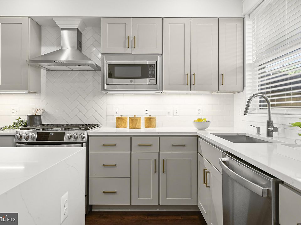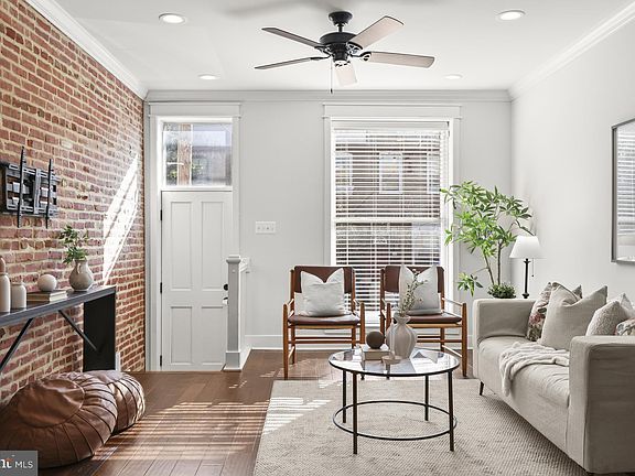 Discover the best of city living in this stunning Building Character renovation, complete with 7 years remaining on the CHAP tax credit (annual taxes less than $4,000)- a rare opportunity with long term savings! Inside, you’ll find soaring ceilings, exposed brick, crown molding, and gleaming hardwood floors that create a warm, sophisticated feel. The spacious living room flows into the dining area, highlighted by custom built-ins perfect for display or audio equipment. At the heart of the home, the chef’s kitchen features a dramatic waterfall quartz island with seating, 42” soft-close cabinetry, subway tile backsplash, quartz counters, and premium stainless steel appliances—an ideal space for both daily living and entertaining. The upper level boasts a luxurious primary suite with a walk-in closet, recessed lighting, hardwood flooring, and a spa-like en-suite bath with dual vanities and a glass-enclosed shower with dual shower heads. A second bedroom with vaulted ceilings and exposed brick has easy access to a designer hall bath with rain shower. A convenient laundry closet completes this level. From here, head up to the private rooftop Trex deck with panoramic skyline views, the perfect spot for entertaining or relaxing. The fully finished lower level offers incredible flexibility with a third bedroom, full bath, private office, or optional fourth bedroom, plus extra storage space. Additional features include a whole-house audio system for a truly modern lifestyle. Outside, enjoy the convenience of a private TWO CAR parking pad, a true city luxury. With unmatched craftsmanship, high-end finishes, and an unbeatable Brewers Hill location near I-95, I-895, and I-83, this home is a rare find you won’t want to miss!