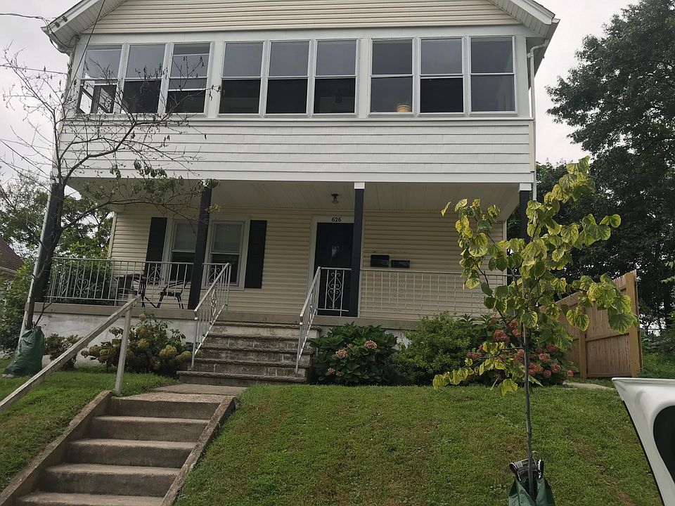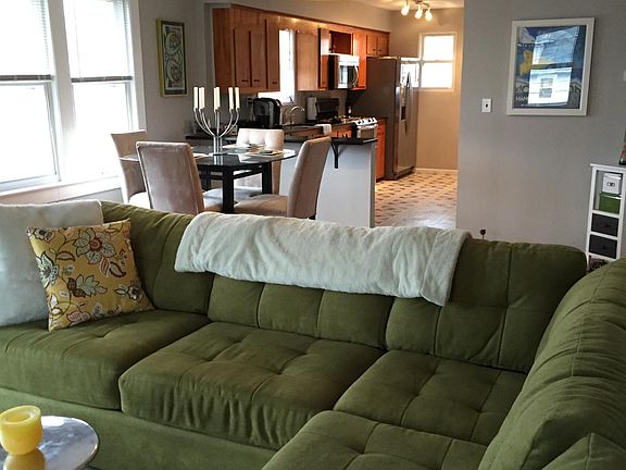 Bright & Sunny 2nd floor with open living room/ dining area/kitchen. Front and back stairs. Stainless steel appliances, granite counters, with breakfast bar. Updated bathroom with stall shower (no Tub). Central air, newer windows, hardwood floors except for bedrooms. Huge front screened in private front porch. Small back deck overlooking back yard and apple tree. Off-street parking for 2 cars. Separate washer and dryer in basement. Huge unfinished, walk-up attic the perfect spot for exercise or yoga or just lots of storage. Pets with pet interview. Monthly pet rental $50 per pet. 2 Bedroom 1 bath, convenient, quiet location. 2nd floor. Available to be seen in person Feb 10, text or call for more photos or layout