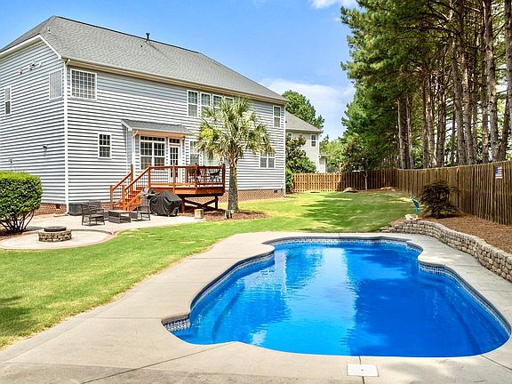 Welcome to 626 Toledo Court—a show-stopping retreat tucked away on a serene cul-de-sac in the heart of Rolesville! This home has every feature you've been dreaming of and then some. Step outside into your own private resort-style backyard, complete with a custom in-ground saltwater pool, sun deck, and lush landscaping—perfect for unforgettable summer parties, family gatherings, or peaceful evenings under the stars. Inside, the luxury continues with a state-of-the-art in-home movie theater, featuring a top-tier projector (included with the sale). The open-concept living space is drenched in natural light and showcases gorgeous hardwood floors, a gourmet kitchen with granite countertops, stainless steel appliances, and an oversized island perfect for entertaining. The home features a main-level bedroom with a full bath—ideal for guests or multi-generational living. Upstairs, the primary suite is a true sanctuary with a spa-like en-suite bath and two spacious walk-in closets. One secondary bedroom features a private en-suite bath, while the remaining two share a Jack and Jill bathroom—offering privacy and convenience for everyone. Other top-tier upgrades include a brand-new HVAC system, a tankless gas water heater, custom built-ins, designer light fixtures, and a fully fenced backyard for added privacy. Located just minutes from charming Downtown Rolesville, parks, and shopping—this home truly has it all. 626 Toledo Court isn't just a home—it's a lifestyle upgrade you never knew you needed. Come experience it for yourself!