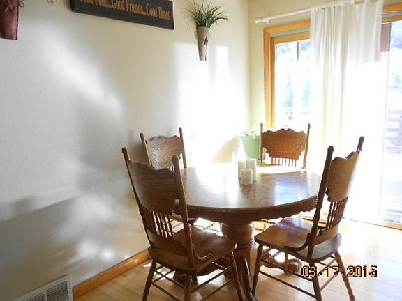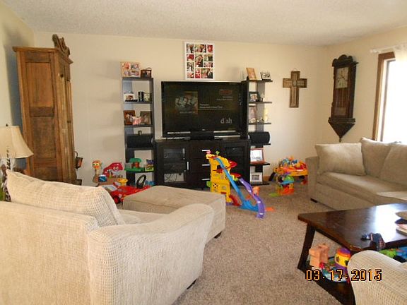 Well-maintained, 5 bedroom, 2 full baths, pine doors and trim throughout, maple floors in dining area and stairway. Central air. Insulated media room with double sheet-rock for sound deadening has built-in, flat-panel stand for your TV with center-channel speaker placement, room wired for 7.1 surround sound for your speakers. Large laundry/utility room with washer/dryer, huge sorting table and second refrigerator. Over-sized 2 car garage with 8 ft door, workshop, 220v outlet plus air conditioning and heating. Master bedroom has room for king-size bed plus door that opens to the expansive trex deck. Big fenced back yard with automatic sprinkler system and timer. Floor insurance area. Gravel area for RV or trailer, fire pit. Great family home, rural setting, city utilities.
