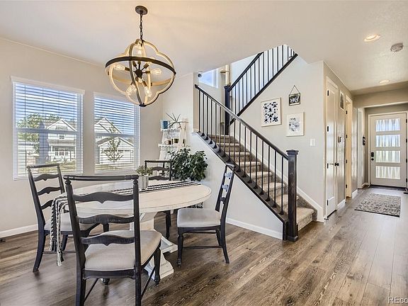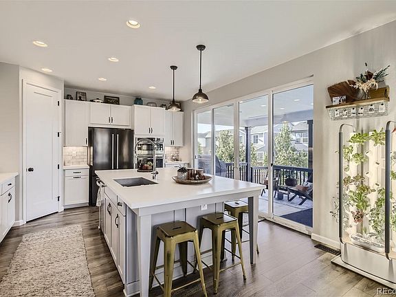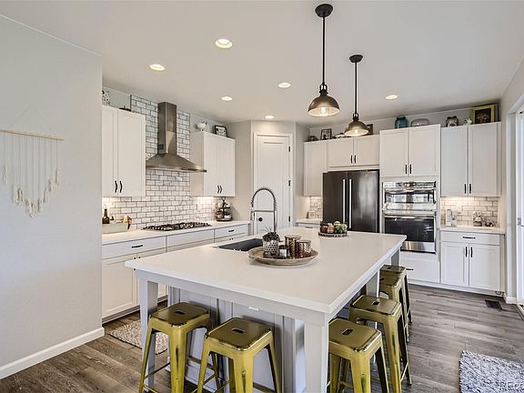 Discover the appeal of this 4 bedroom, 3 bathroom home, where every upgrade and finish has been meticulously curated, matched with a layout that seamlessly blends modern elegance and practicality. Upon entry you are greeted by 8 foot solid wood doors and a main floor bedroom with an adjacent 3/4 bathroom featuring an art deco tile floor, a tile shower, corian countertop with an undermount sink and large linen closet. The open floor plan flows into the bright kitchen, boasting contemporary white cabinets, stylish light fixtures, double ovens, a gas cooktop with subway tile backsplash, farmhouse sink, spacious pantry, and a custom extended island which allows for seating up to six. The extra-large sliding glass door leads to the covered patio and a backyard reminiscent of Denver Botanic Gardens, complete with a hot tub, designated corn-hole area, multiple spots for seating, and a versatile side yard waiting for your personal touch. You can easily access the fully finished two-car garage through the utility side door. Back inside, travel upstairs on the high-quality carpet to a flexible landing space perfect for gym equipment or hobbies, the laundry area, as well as three bedrooms and two bathrooms. The primary bedroom offers mountain views, custom blackout window treatments, a walk-in closet and a luxurious 5-piece bathroom. The neighborhood is conveniently located just 25 minutes from Denver, Boulder, or DIA and surrounded by trails, parks, restaurants, shopping, and a hospital.