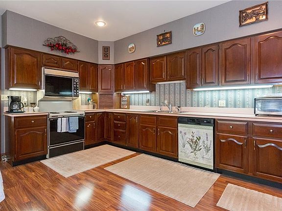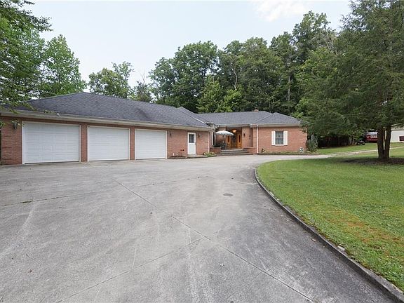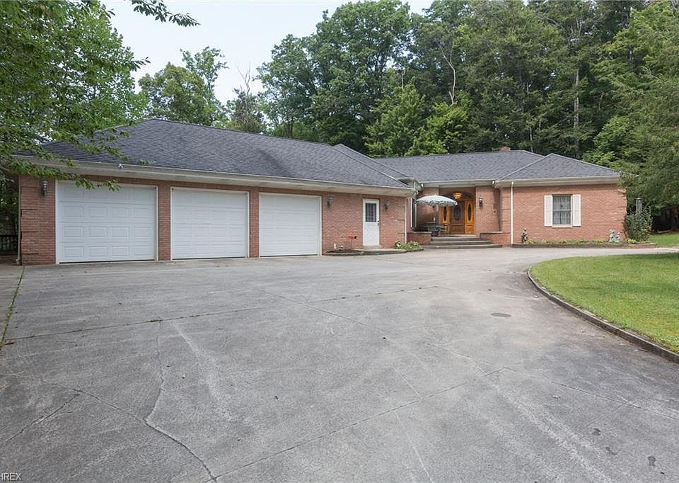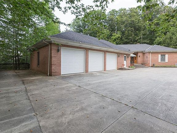 Custom solid brick ranch, one owner home. Large master suite plus 2 more good sized bedrooms. Great room, large dining room 2-1/2 baths. Huge basement, 3 car garage on over 5 acres of privacy. 40 x 40 detached garage/workshop ??? all dry walled, electric, heat and water. Deep driveway, surrounded by woods.