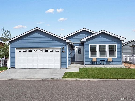 Back on market as previous buyer lost job. BRAND NEW ROOF (8.27.24). Built in 2019, this modular ranch home offers the latest finishes with an open floor plan and high ceilings for a spacious feel. Dine informally or spread out to work or do homework on the large double kitchen island. Stainless steel appliances, solid surface counters, abundant cabinet space, and great lighting are just a few of the kitchen and dining area features. The cozy living room includes a stone-surrounded electric fireplace and a large sliding glass door that opens to your concrete patio and well maintained yard. Plus, enjoy no neighbors directly behind your home. The primary bedroom features its own ensuite with a double vanity sink, a giant walk-in shower, and a walk-in closet. There are two additional bedrooms, both with extra large closets and a full bathroom. The laundry room provides ample space and built-ins to make folding easier. The oversized two-car garage offers convenient backyard access. The home sits on a four-foot crawlspace, perfect for extra storage! Peace of mind included with a new water heater. Enjoy the convivence of a short walk to the Park, Clubhouse, Fitness Center, and Pool. Plus, easy access to I-25 or Hwy-85. Shopping, restaurants, coffee shops, and gas stations are all within minutes away. The land lease includes lease of the land, road maintenance, street snow removal, clubhouse, fitness center, outdoor pool, and playground/park (NO HOA FEE - just the land lease fee). Schedule your showing today to experience the charm firsthand at Prairie Greens!