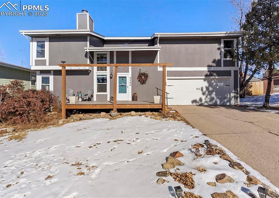 Beautiful, well-maintained home in an established quiet neighborhood with fantastic Pikes Peak views. Located on a corner lot with a huge fenced, backyard. A brand new deck off the front of the house to enjoy the Colorado sun and front-range views! With 5 bedrooms, 4 bathrooms, 2 family rooms, 2 fireplaces, and a large, finished basement- this home has it all! The spacious primary suite on the upper level includes a sitting area with a cozy wood-burning fireplace, two closets, a private bathroom, and views for days! This is definitely worth seeing! Also on the upper level are another 3 large bedrooms and a full bath. Second-floor railing overlooks down to the lower living area, and a large skylight offers ample sunshine. The lower level has one bedroom, a recreation room, a ¾ bath, and lots of natural light. The kitchen has a breakfast nook that is perfect for casual family meals and adjoins one of the two family rooms. You can enjoy the fireplace in the other family room which has 2 separate sliding doors that lead to a large wrap-around deck. Mature trees, shrubs, and a fenced backyard compliment this park-like setting large lot. Access on the side of the house to park an RV or camper. This location provides easy access to I-25, all military bases, and the area’s best shopping, restaurants, and entertainment.