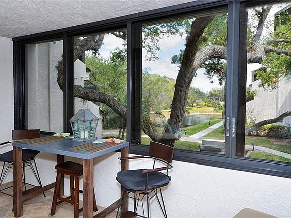 SIESTA BEACH ACCESS! Beautifully updated end unit on second floor at this Gulf to Bay community overlooking pond and tropical gardens with access to Intracoastal Waterway and Siesta Key's No. 1 White Sand Beach. Big and Roomy with Designer Features including 20" tile on the diagonal throughout, spacious kitchen with GE stainless steel appliances, granite countertops and an extra built in wine bar with a beverage cooler. Closets Galore give extra storage space and the master closet was designed by Closet Tec. Impact windows throughout, except in the lanai. Hardwood 4.5" plantation shutters, crown molding and 5" baseboard throughout. Tankless hot water heater. Laundry in Residence and carport. PET FRIENDLY. Lounge chairs on private beach. Great opportunity for rental with on-site manager and 2 week minimum. Excelsior offers two pools, a spa, tennis courts, pickleball, a fitness center and fishing pier. Just a short stroll to shopping and restaurants. Enjoy the charm of Siesta Key and all the cultural activities Sarasota has to offer.