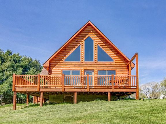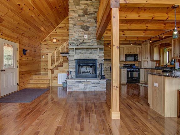 Beautiful log Chalet setting on top of the world with 360 degree panoramic views&18+acres. The house has two master bedrooms one on entry level& one on upper level, also loft that can be used for third bedroom. The entry level has open living area with cathedral ceiling, stone wood burning fire place, kitchen & dining area. Granite counter tops in kitchen & bath rooms. Entry level has half bath & laundry room. Hardwood floors through out. Decks on three sides. The views from the great room & decks of the valley & mountains are fantastic. one out buildings. approximately 8 acres open & the remaining 10 acres in mixed hard woods with trails. 30 minutes from VA Tech. Access to Appalachian trail. Cedar decking and logs have been recently stain. Kitchen has hand carved rhododendron door pulls,