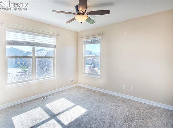 Grand Ranch with rich oak flooring and large open design. The gourmet kitchen features slab granite counters, stainless appliances, 4 burner gas range and an eat-in bar. The dining area can accommodate a large table for 8-10 people. Or, use the office as your dining area and enjoy a mountain view with your meal. Main level walks out to a covered composite deck, with stairs down to a patio below. Maintenance free living at its finest with lawn care and snow removal to the house included. The main level master suite has a lavish bath with raised vanities, a separate shower and tub, and a walk-in closet with custom organized shelving and baskets. The lower level has a spacious family room with wet bar, two additional bedrooms, another full bath, and plenty of storage in the unfinished space. Central air, ceiling fans, and oversized garage. This home is built to energy star standards. Located next to an open area for great mountain views to the west. Don't worry about mowing or watering the grass or shoveling the snow, as the HOA takes care of it all! Conveniently located near hospitals, restaurants, shopping, entertainment, Peterson AFB and The Air Force Academy. Walking distance to the neighborhood park. Welcome home!