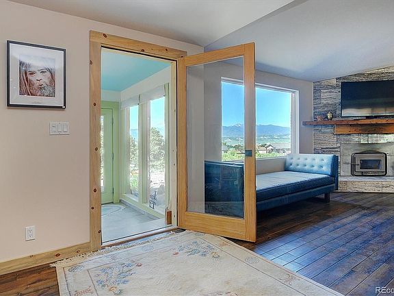 A must-see! Beautifully updated home in Pinon Hills with locally sourced, rough sawn, spruce siding and rustic corrugated metal panels, complementing the original brick chimney. A metal roof was newly installed in 2018. Front yard boasts a meticulous landscape design including river rock, pea gravel, and lava rock; combined with native, drought-resistant plants. Floor-to-ceiling entrance windows in the enclosed sun room create the perfect place to enjoy your morning coffee, or to unwind at the end of the day watching the sun set over the Sawatch Range. A wood burning fireplace, set in a travertine hearth, provides an inviting living room space in the winter months. Hand-scraped maple hardwood flooring throughout the home in the living room, kitchen, dining, and master bedroom, combined with engineered hickory in the other two bedrooms. The primary bedroom boasts a large 9' x 12' walk in closet with a built-in dresser, shelves, and new flooring; garage access through the primary closet. Primary bathroom is your own private oasis, complete with a deep soak tub, curb-less entry to a walk-in shower with a rain shower head and river rock bottom, and floor-to-ceiling tile. The second bathroom is equally a "must-see" with a custom tile shower. This home won't last long!