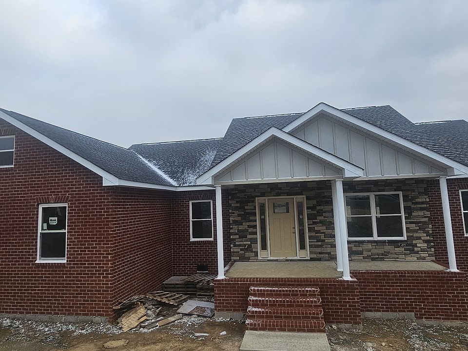 Exterior highlights include a predominantly brick design with stone entry, and vinyl, two covered porches, and a two-car garage.