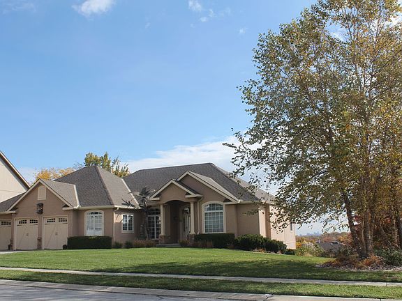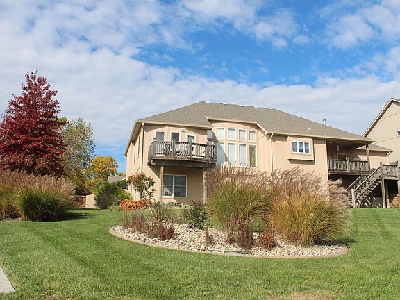 Recently reduced to $375,000! Motivated to sell! Custom-built beautifully, meticulously maintained REVERSE 1½ story in Thousand Oaks! Everything you need on the main level including laundry and office. Very open floor plan: the living area is the center of entertainment with the great room flowing into the dining and hearth rooms. The great room has 12' ceilings, crown molding and floor to ceiling windows that showcase the view of the Missouri River valley and KC skyline. The dining area, hearth room and kitchen have shining hardwoods and offer lots of storage areas (walk-in pantry, extra pantry with roll-out shelves and drawer, and desk) and the hearth room has built-in bookcases by the fireplace and French doors to the covered deck. The kitchen has a large island, cooktop with downdraft vent, enhanced cabinetry with roll-out shelves and lazy susan shelving in corner units plus solid-surface countertops. The home's master suite boasts a huge bathroom, double shower, whirlpool, large closet and romantic private deck. The huge 4-CAR GARAGE with 8' tall doors with extra width on the tandem door and great raised flooring, beamed engine hoist and entry to the back deck. The lower level offers family room, bar, two bed/bathrooms, game room with door to patio, extra storage space including a large cedar closet and a storm shelter. Bonus: professionally designed landscaping. Must see to appreciate!