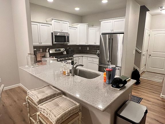 Extended wood flooringGas stoveStainless steel appliancesQuartz counter topWhite cabinets
