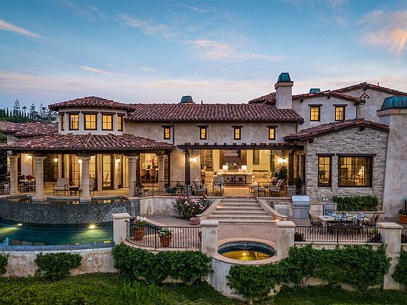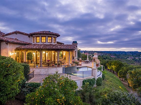 A private retreat perched around and above the citrus groves at The Bridges of Rancho Santa Fe, this meticulously detailed custom estate will overload your senses. The second you open the front door you are greeted by an environment of privacy and tranquility, with an extraordinary backdrop overlooking rolling foothills, and two lush fairways. One of the most elevated and picturesque sites in all The Bridges. Evoking the architectural details of Mediterranean layout is grand in both scale and beauty.