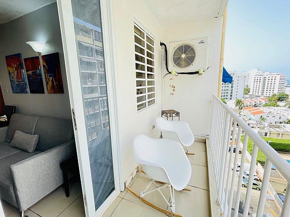 Turn on key - Just Listed ! Enjoy an open spacious all recently remodeled living space studio with one bath en-suite. Split unit, curtains and furniture, painted in neutral colors. Tastefully decorated with appliances. Exterior balcony ocean side views. Excellent location! Steps to five star hotels, restaurants and shopping. Minutes to the airport (SJU), town of old San Juan and major Malls. Saint Tropez offers: Secured gated building, pool , private BBQ area, 24/7 security guards on-site-laundry, new elevators. Steps to All Isla Verde Has To Offers. In maintenance fees water is included. No pets - Good credit a MUST- Long term lease. One Parking space first come first serve with sticker. Owner pays for water & HOAF
