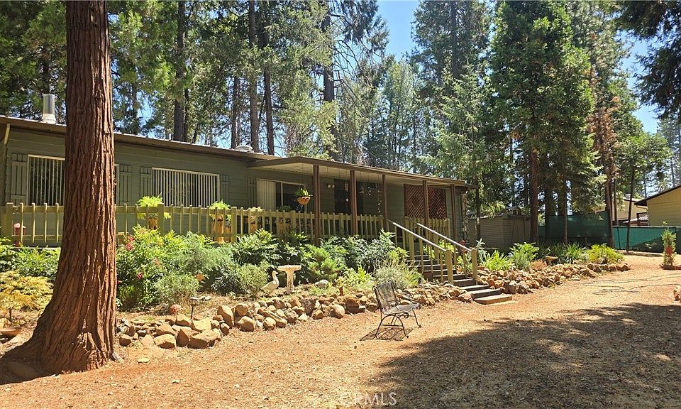 FABULOUS REMODELED HOME ON FULLY FENCED DOUBLE LOT!! Check out this remodeled home with new appliances, central heating & air, laminate flooring, fresh paint, new bath vanities & walk-in shower stall. This home features a spacious open floor plan with plenty of kitchen and dining room space that flows nicely to the living room & front door entry. A short hallway leads you through a sliding barn-style door to the master bedroom & private bathroom with a full tub/shower, walk-in closet and additional walk-in storage space. At the end of the hall is the guest room with a walk-through closet space with closet space on both sides of the walk-through to the guest bath featuring new sink/vanity & walk-in shower stall. Both bedrooms provide private access to adjacent bathrooms as well as lots of closet & storage space! Step out the front door onto your large covered front porch that overlooks your fully fenced 1/2-acre of land, 2 storage units, detached 2-car garage and drive through double gates for RV access & parking as well as easy access to your yard for upkeep & maintenance. There is also a lovely little concrete patio area tucked between the home & garage just outside the back door that is perfect for a nice BBQ area! With a sunny front yard and shaded & protected in back and around the sides with towering trees, this property offers a little bit of everything. The property is also conveniently located just minutes from a grocery store, various shopping options, the post office & several restaurants. It also offers a quick and easy commute to Paradise, Oroville and Chico. For outdoor enthusiasts, this lot is a short drive from recreational opportunities such as fishing, water sports, and adventure in Paradise Lake, DeSabla Lake, Lake Oroville Marina, or the Feather River. The property's inclusion in the Paradise Pines Property Owners Association enhances its appeal & charm, offering access to amenities such as a swimming pool and spa, pickleball and bocce ball courts, a children's playground, hiking trails, a clubhouse with meeting rooms and a library, dual event centers with fully equipped kitchens, and a bar and lounge for special events and community gatherings.