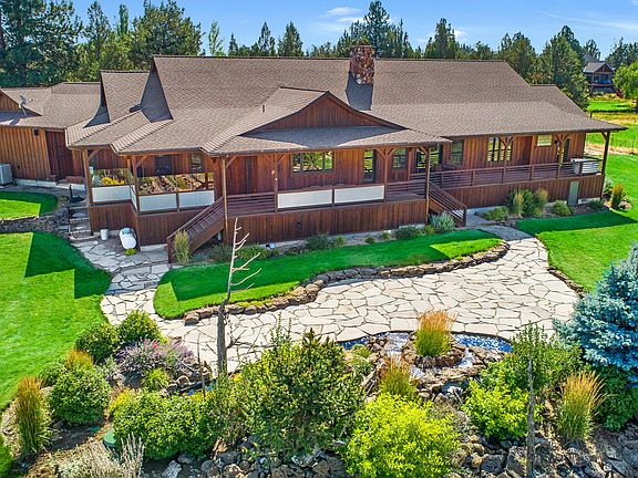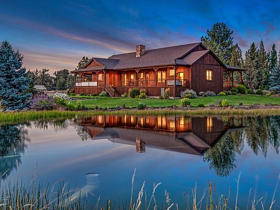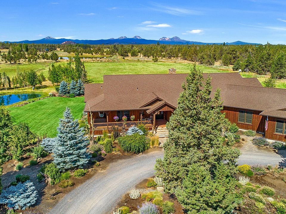 This remarkable 9.75-acre secluded sanctuary boasts breathtaking Cascade Mountain views, over 5 acres of underground automated irrigation, a 36' x 24' shop, & an oversized 3-car garage with 10' doors. Built in 2008, this single-level, 3828sf custom-built home is a true masterpiece, exuding elegance & quality. The main living area features 12' ceilings & 10' ceilings throughout, offering stunning views from Mt Bachelor to North Sister. The kitchen is bright & spacious, with granite countertops. The primary suite is a true oasis, complete with a clawfoot tub, radiant floor heating in the en-suite, & access to the back deck. Two add'l bedrooms, one offering complete privacy for long-term guests with a living area & separate access. The interior is complete with an office, bonus room & spacious mudroom. The exterior features reclaimed wood siding, 1690sf of covered porches, a deck overlooking the pond, a stunning waterfall feature framed by the mountains, an orchard, & a greenhouse.