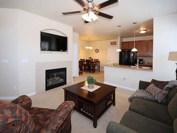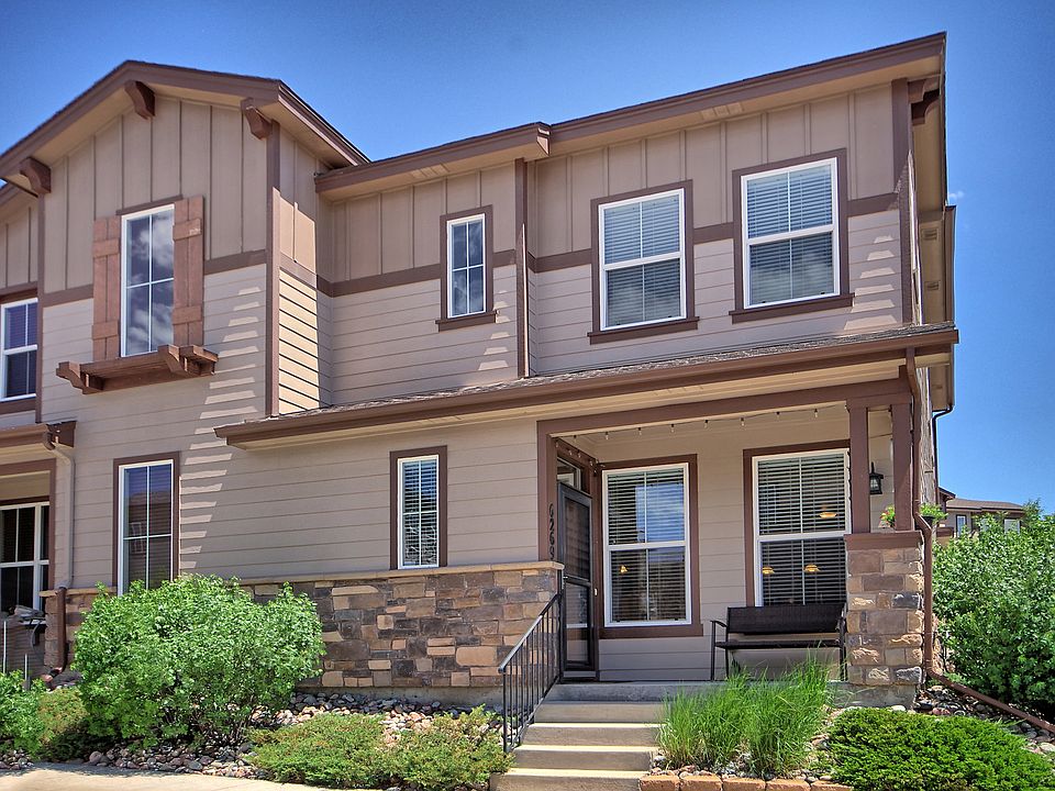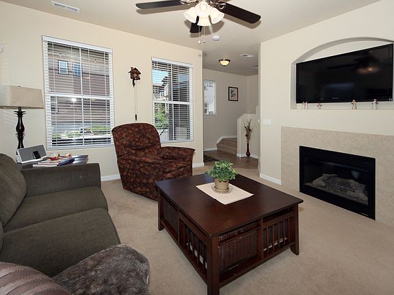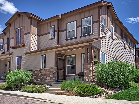This beautiful and bright end unit townhome will not disappoint. The covered front porch leads you through the front door into an open and airy floor plan. The living room offers a ceiling fan, gas fireplace, and many bright windows. The in-wall cord system makes it easy to hide all of your media and TV cables. The spacious kitchen has upgraded 42" cabinetry, a backsplash, smooth top oven range, tile flooring, and a breakfast bar. The sizable master bedroom is perfect for relaxing with a sitting area and views of Pikes Peak. There is also an adjoining bath with a large shower with bench, a double vanity with a granite counter top, tile flooring, and a large walk-in closet. The secondary bedroom also has an ensuite bath, a large walk-in closet, and offers Pikes Peak views! The laundry room is well situated on the upper level. The attached 2-car garage provides main level entry, no need to worry about stairs! Enjoy the community pool in the complex this summer! Conveniently located near shopping, restaurants, schools, and parks! All you have to do is move in!